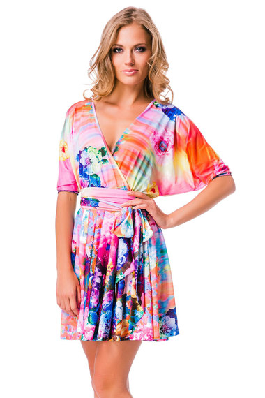 Яркое летнее платье из струящейся микрофибры в розовых тонах. Модель с расклешенной юбкой и рукавами "летучая мышь".